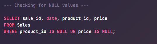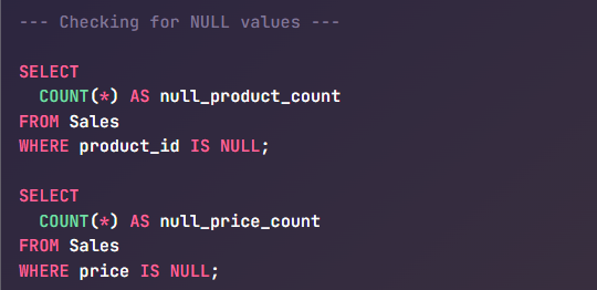 Missing values (NULLs) in key fields can lead to inaccurate analyses (e.g., sales with no product ID or orders with no customer). We can write queries to detect NULLs. For example, to check if any sales records have a null product_id or price: