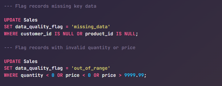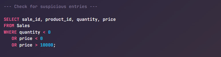 This query flags any transaction where the quantity or price seems questionable. For instance, a price greater than $10,000 might indicate a data entry error unless you're selling luxury goods. Similarly, a quantity of -5 may suggest a return that wasn’t properly categorized.