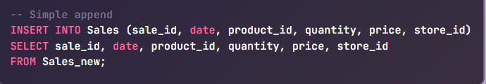 The INSERT ... SELECT statement shown above simply takes all records from the Sales_new staging table and appends them to the main Sales table. After this step, the Sales table will include the new day's transactions. Depending on your needs, you might choose to empty Sales_new after processing or retain it for audit and traceability purposes.