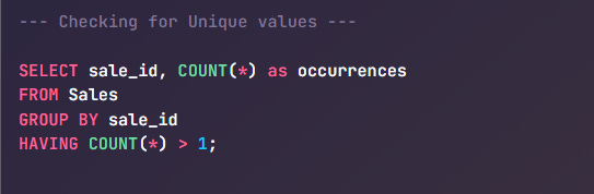 Another important check is uniqueness of key fields. If sale_id should be unique (no duplicate transactions), you can verify: