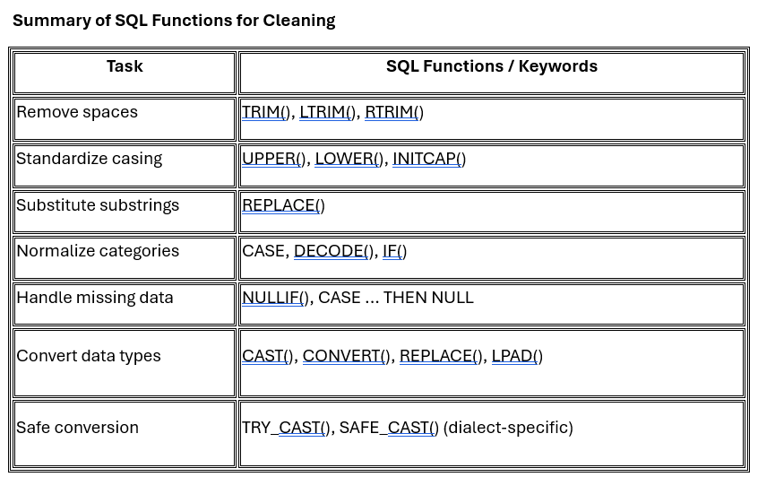 Retail datasets often arrive in messy, inconsistent formats—containing extra spaces, mixed-case labels, placeholder strings, and incorrect data types. SQL offers a comprehensive suite of functions to clean and standardize this data before analysis. Below, we break down key data cleaning categories and the associated SQL functions that should be in every data engineer or analyst’s toolkit.