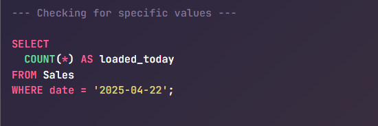 Sometimes you expect a certain number of records or unique entries. For instance, if you load daily sales, you might know approximately how many transactions occur per day (say ~10,000). You can check if the number of rows loaded is in an expected range:
